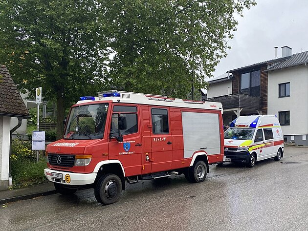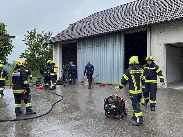 Die FF Ardagger Markt sichert nach dem Eintreffen die Einsatzstelle ab und drückt mit dem Druckbelüfter die restlichen Rauchgase aus dem Gebäude. Feuerwehrarzt Dr. Florian Moser kümmert sich gemeinsam mit den Rettungssanitätern des Roten Kreuzes um eine Person mit Verdacht auf Rauchgasvergiftung.