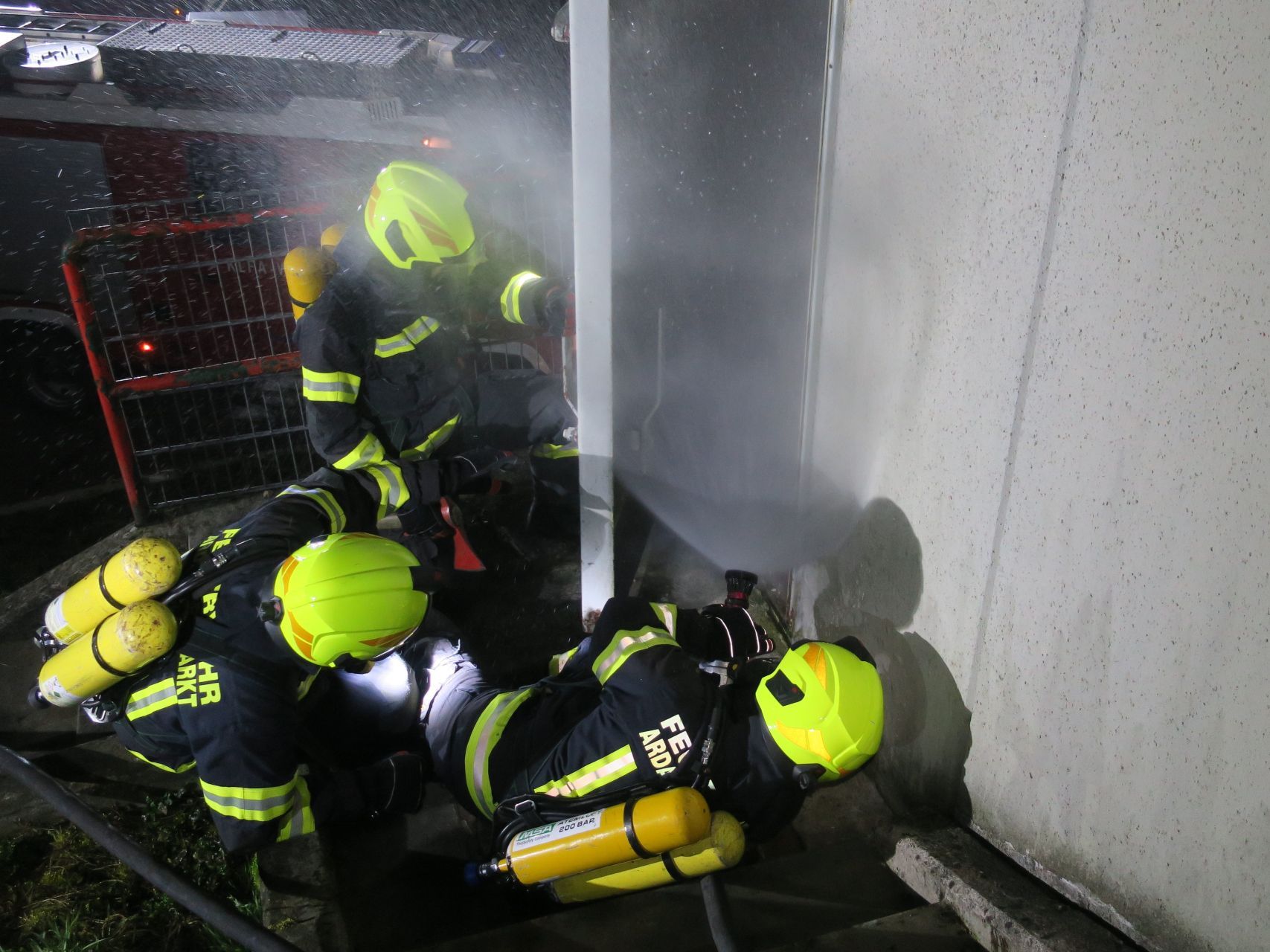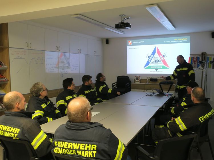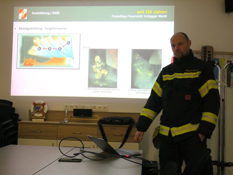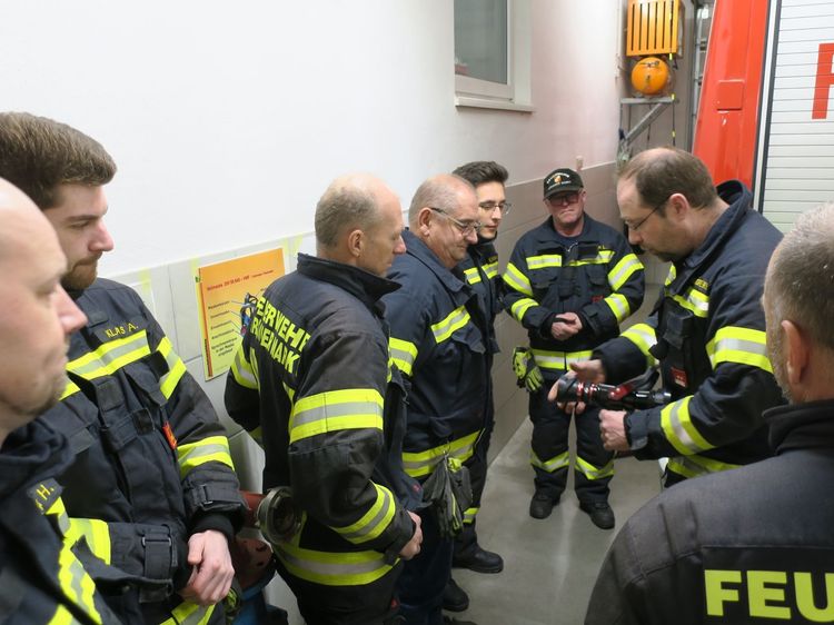 BI Hubert Poustka und OBM Ewald Schaurhofer haben eine Ausbildungseinheit in 3 Stationen vorbereitet. Nach einem theoretischen Teil und einer anschließenden Gerätekunde rückt die Mannschaft zu einer Einsatzübung aus. Dabei wird ein Innenangriff in ein stark verrauchtes Gebäude unter Atemschutz und mit einem Hohlstrahlrohr durchgeführt. Die richtige Anwendung des Hohlstrahlrohrs zur Rauchgaskühlung, Brandbekämpfung und zur Brandraumbelüftung steht dabei im Fokus.