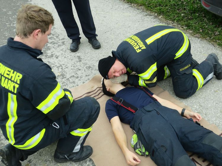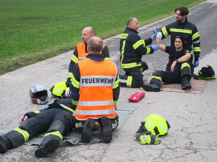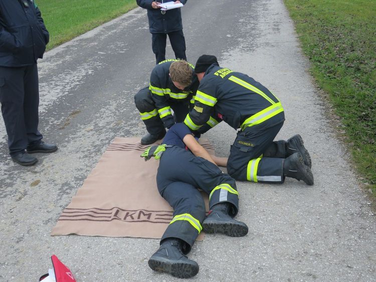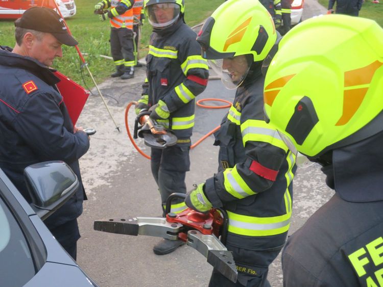 Zusätzlich zur korrekten Durchführung einer Einsatzübung "Verkehrsunfall mit Menschenrettung" werden auch die Geräte in den Einsatzfahrzeugen, sowie die Kenntnisse in Erster Hilfe überprüft.