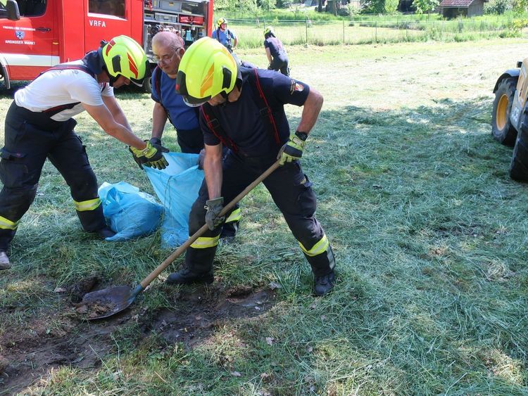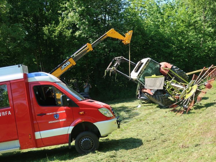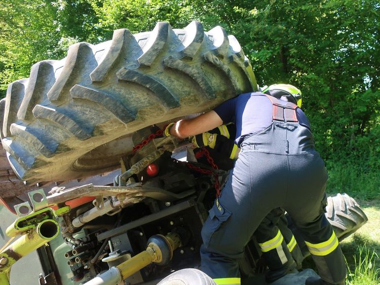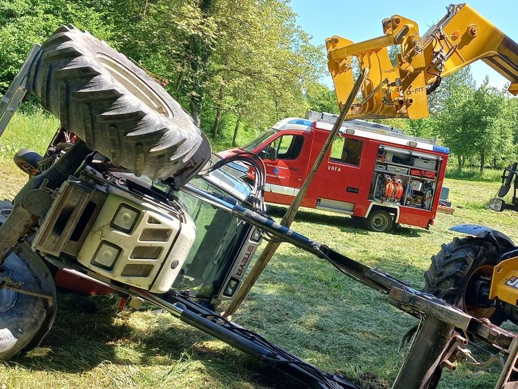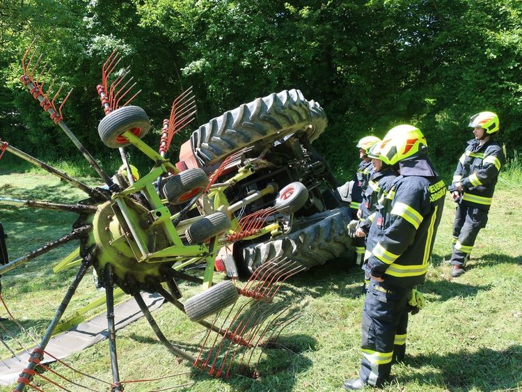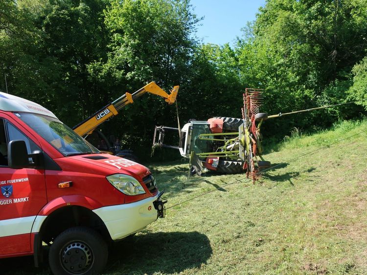 Ein Traktor liegt an einer steilen Wiese auf der linken Seite, Hydrauliköl läuft in geringen Mengen aus, und der Traktorlenker ist entgegen der Alarmmeldung unbestimmten Grades verletzt. Es wird daher der Rettungsdienst nachalarmiert. Einsatzleiter BI Alexander Klaus stimmt sich mit dem etwas später eingetroffenen Traktorbesitzer zu den Details der Bergearbeiten ab. Der Traktor wird anschließend mit der Seilwinde des Vorausrüstfahrzeugs über eine Umlenkrolle und unterstützt durch einen Teleskoplader wieder aufgerichtet. Die Wiese wird durch die Feuerwehr von Glassplittern und ausgelaufenem Hydraulköl befreit. Nach ca. 1,5 Stunden ist der Einsatz beendet.