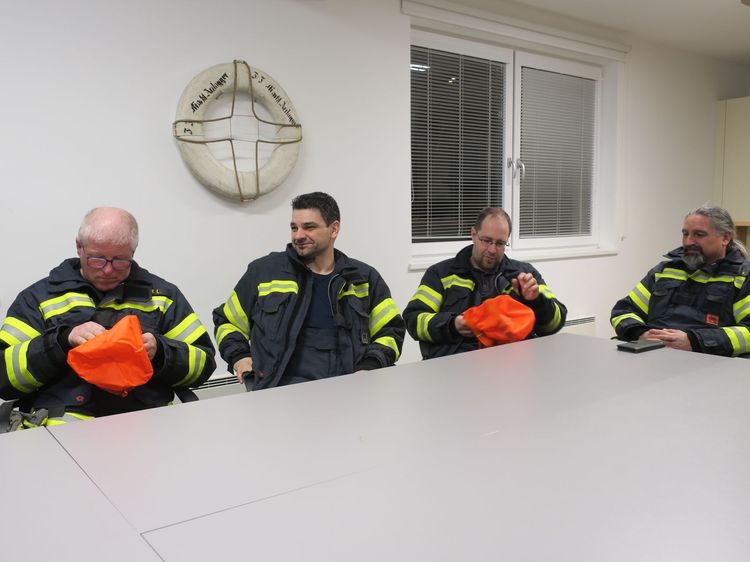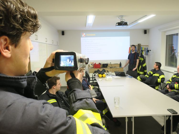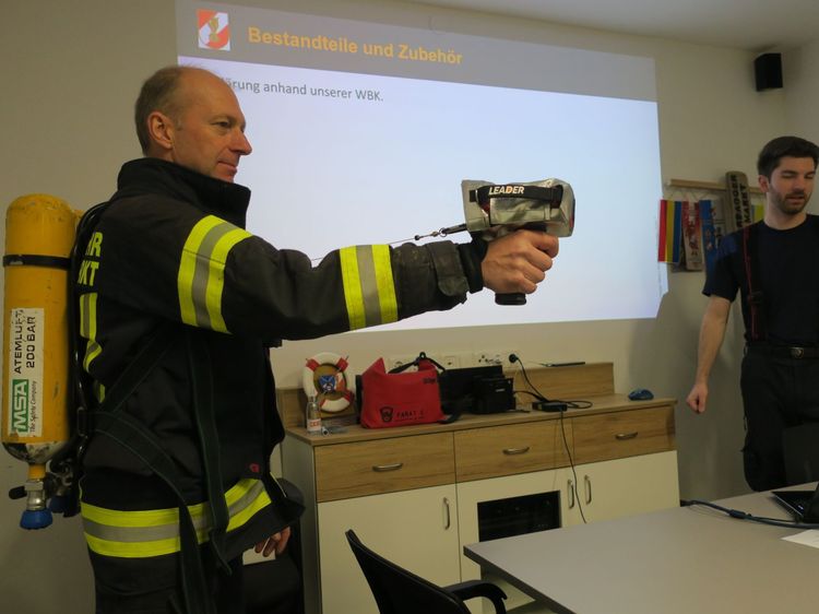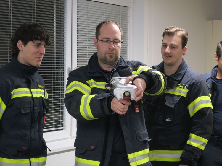 Kommandant Alexander Klaus erklärt den Schulungsteilnehmern die Möglichkeiten, Vorteile, Bedienung und Handhabung der neuen Wärmebildkamera samt Zubehör. Nach einem theoretischen Teil erfolgt der Praxistest durch die teilnehmende Mannschaft. Dieses Gerät wird bei zukünftigen Brandeinsätzen eine wertvolle Hilfe sein.