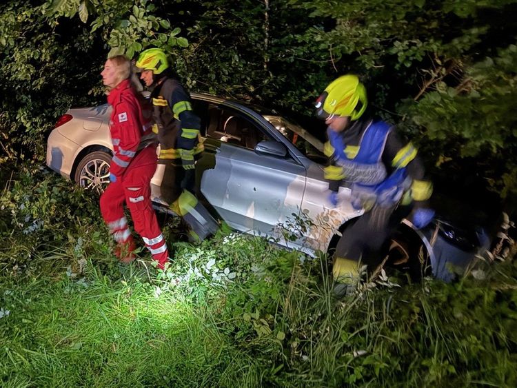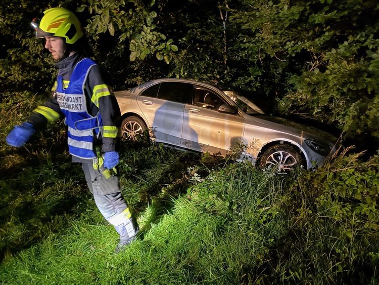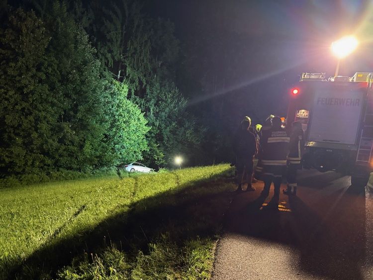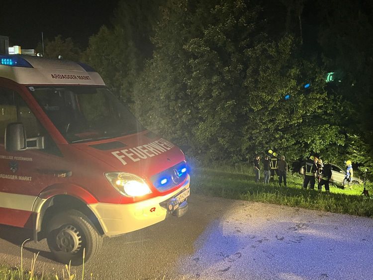 VORAUS Ardagger Markt trifft als erstes am Einsatzort ein und erkundet sie Lage. Ein PKW ist von der Straße abgekommen und über eine steile Wiese bis zum Waldrand abgerutscht. Zwei Personen befinden sich noch im Unfallfahrzeug, scheinen aber entgegen der Alarmmeldung nicht verletzt zu sein. Der kurze Zeit später eintreffende Rettungsdienst kümmert sich in weiterer Folge um die Fahrzeuginsassen.