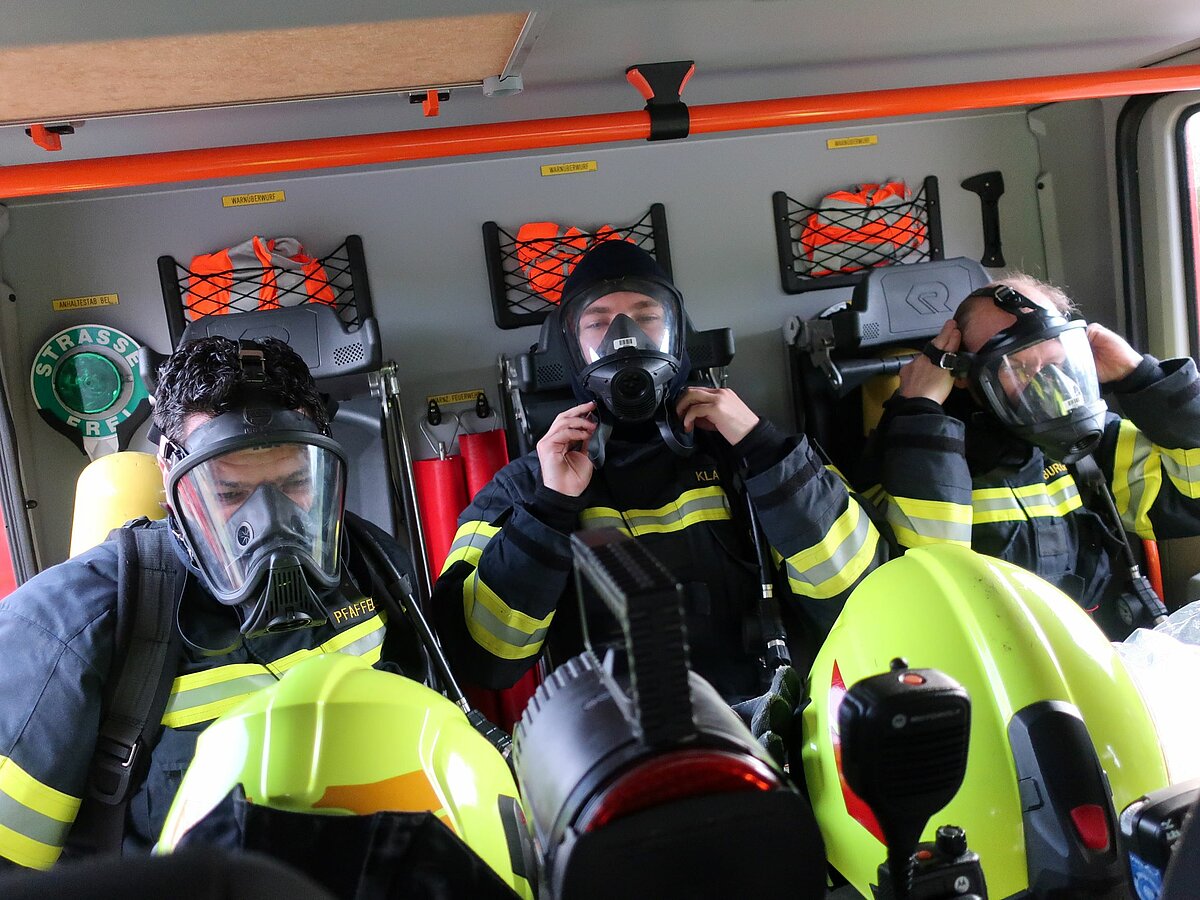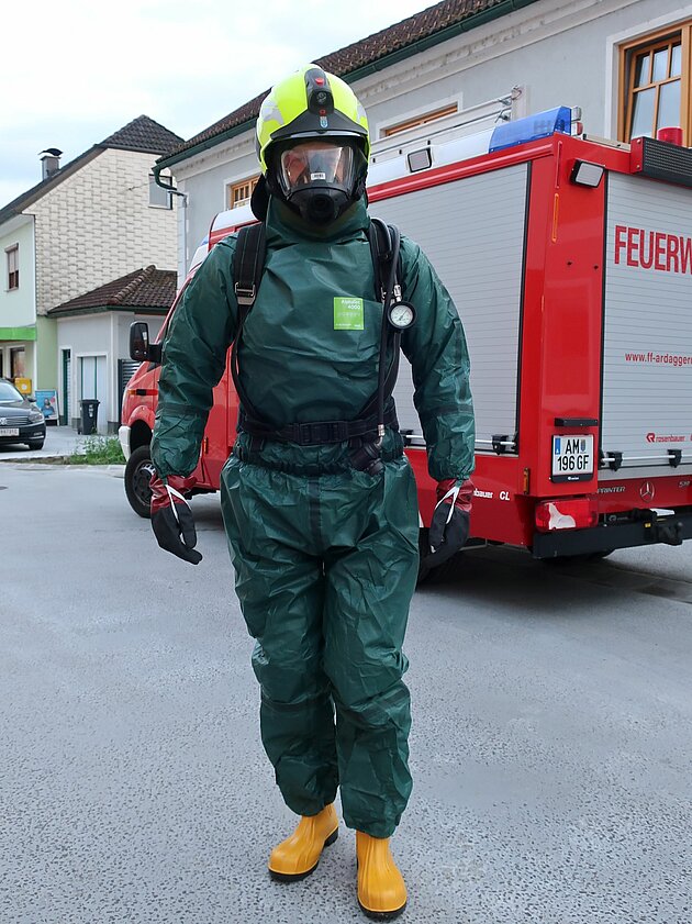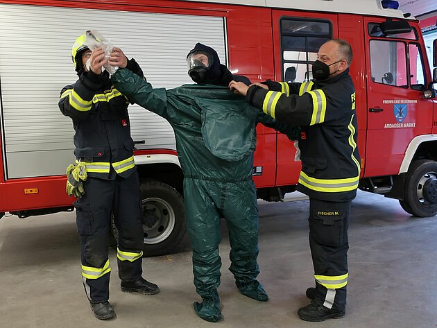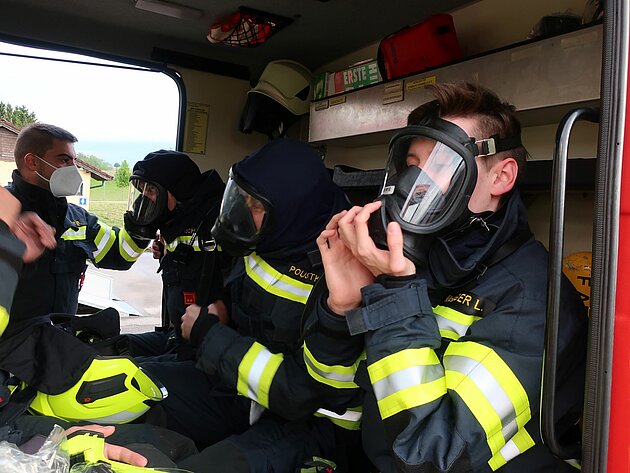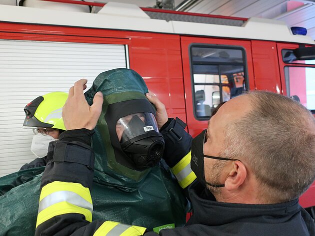 Das korrekte und sichere Ausrüsten mit schwerem Atemschutz war der Schwerpunkt dieser Übung. Und auch die neu eingetroffenen Schutzanzüge der Schutzstufe 2 für Schadstoffeinsätze werden ausgepackt und anprobiert.