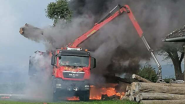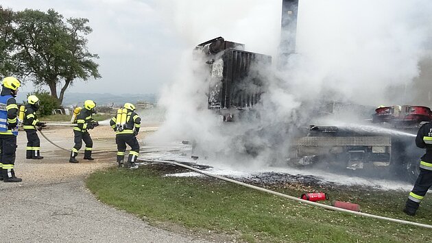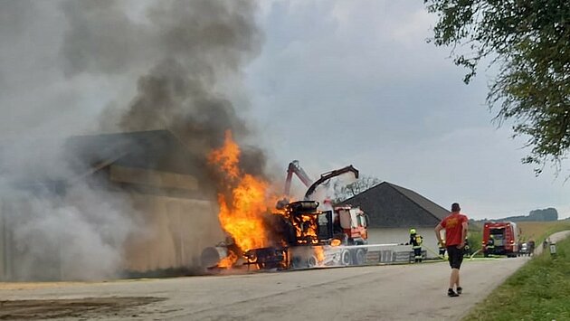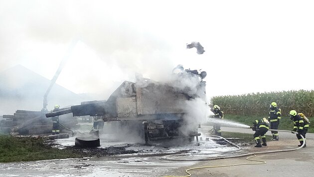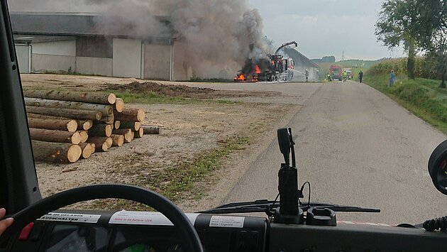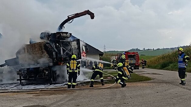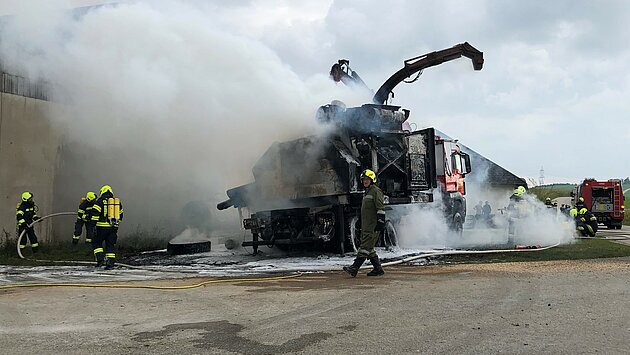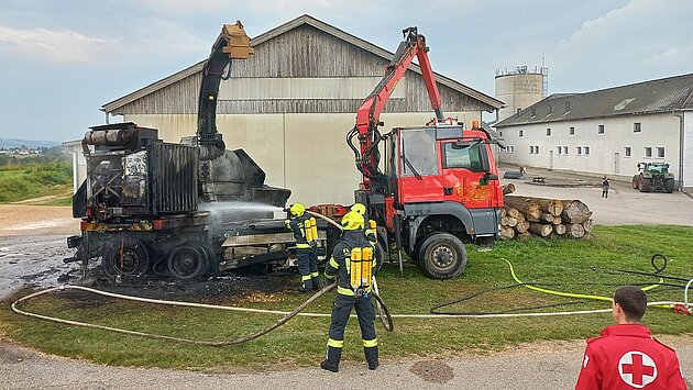 Sofort nach der Ankunft beginnt der Atemschutztrupp einen Löschangriff mit einem C - Hohlstrahlrohr. Der Brand kann mit vereinten Kräften der insgesamt 6 ausgerückten Feuerwehren schnell unter Kontrolle gebracht werden. Von der Maschinenhalle kann Schaden abgewendet werden, die Hackmaschine wird leider ein Raub der Flammen. Die Nachlöscharbeiten nehmen noch einige Zeit in Anspruch, aber nach etwas mehr als einer Stunde kann die Feuerwehr Ardagger Markt wieder einrücken.
