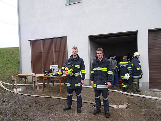 Die Mannschaft der FF Ardagger Markt unterstützt mit schwerem Atemschutz die Löscharbeiten am Heuboden.