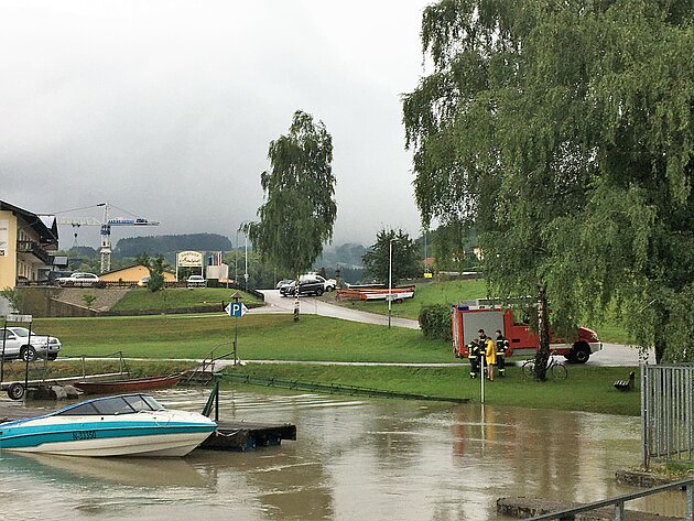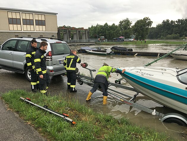 Um 8:48 Uhr erfolgt dann der erste Alarm über die Bereichsalarmzentrale Amstetten. Es ist sicherzustellen, dass sich keine Personen mehr im Gefahrenbereich entlang der Donau aufhalten. Dies wird über eine Kontrollfahrt am Treppelweg durchgeführt, wobei der Treppelweg bereits teilweise überflutet ist. Die Donau fällt schon über eine längere Strecke in das Machland ein. Danach unterstützen wir einige Bootsbesitzer beim Verladen ihrer Boote auf Anhänger.