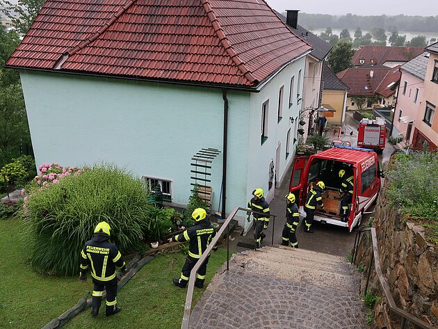 Am Nachmittag erneute Alarmierung aufgrund eines überfluteten Kellers in der Kirchengasse. Der Keller wird mit dem Nasssauger von Wasser und Schlamm befreit. Für den Fall weiterer schwerer Regenfälle wird mit Sandsäcken eine "Umleitung" für die Oberflächenwässer aufgebaut.