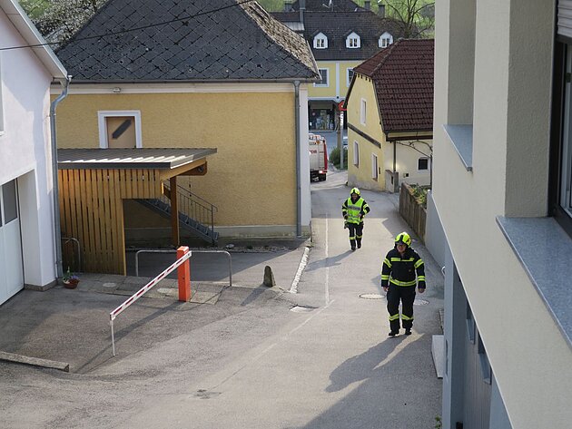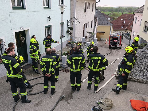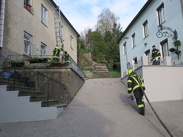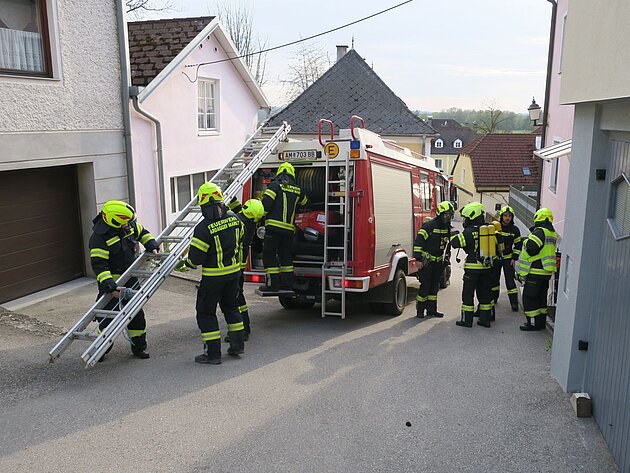 Sehr eng und sehr steil, schon alleine die Anfahrt mit Einsatzfahrzeugen ist eine Herausforderung: Das ist die Kirchengasse in Ardagger Markt. Eines der beiden am höchsten gelegenen Gebäude der Gasse ist Schauplatz dieser Einsatzübung. Zugskommandant OBM Ewald Schaurhofer hat dazu eine anspruchsvolle Übungslage vorbereitet.