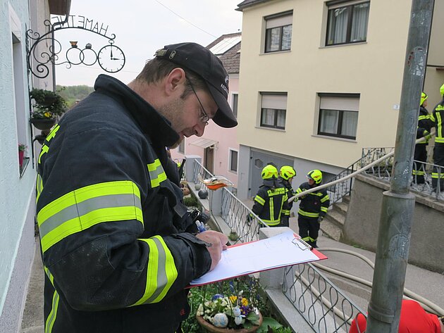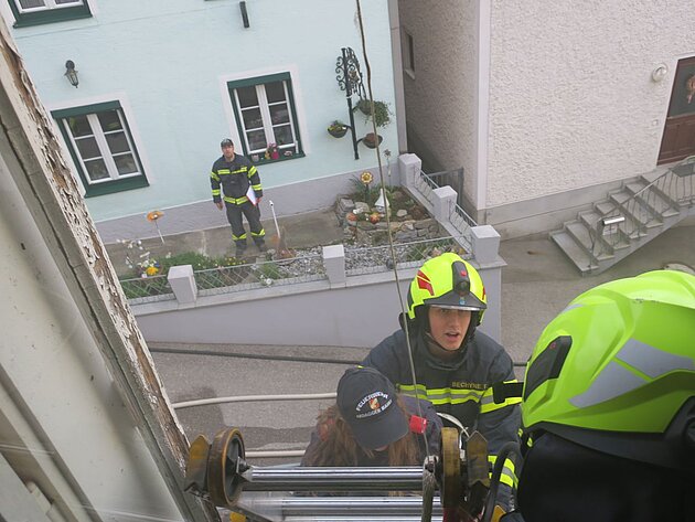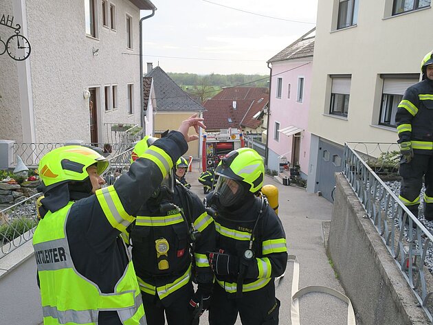 Durch den Einsatzleiter Kommandant OBI Markus Fischer wird nach der Erkundung die Rettung der Personen über eine Leiter, sowie die Brandbekämpfung mit schwerem Atemschutz angeordnet. Die Rettungs- und Löscharbeiten werden mit einem Druckbelüfter unterstützt. Auch das steile Gelände mit Gebüsch hinter dem Brandobjekt wird aufgrund der Gefahr einer Brandausbreitung berücksichtigt.