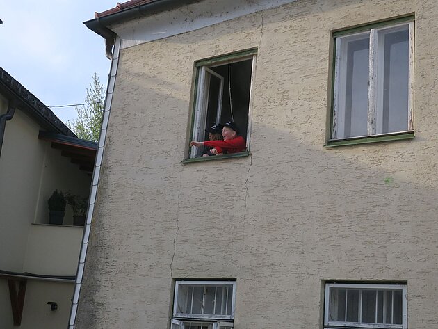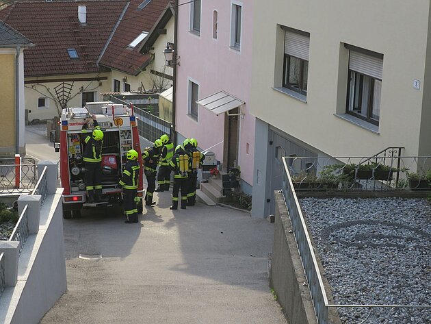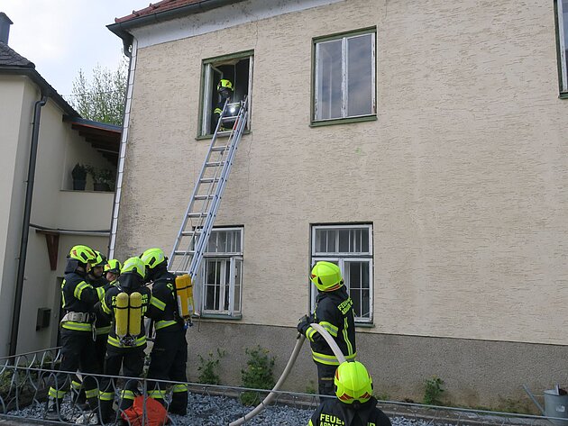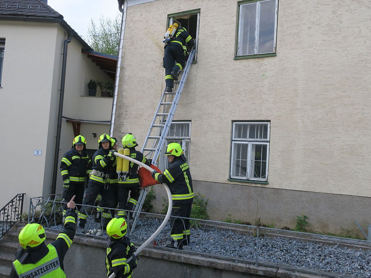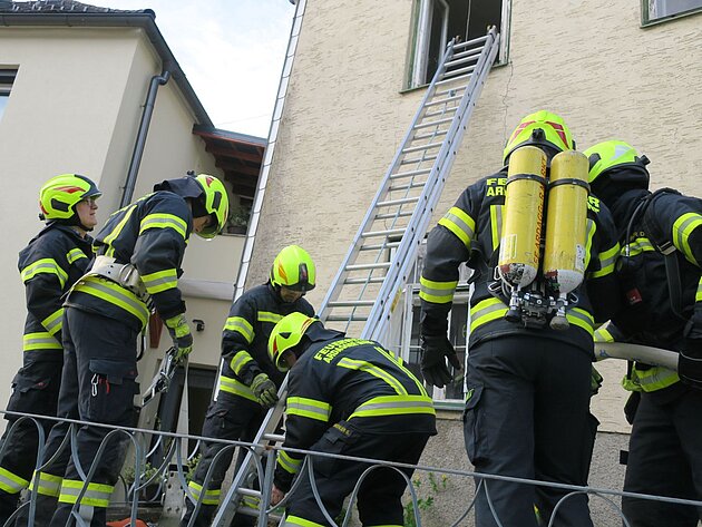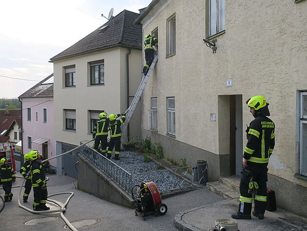 Im Erdgeschoß ist ein Brand ausgebrochen, welcher die aus Holz bestehende Stiege ins Obergeschoß unbrauchbar machte. Das gesamte Gebäude ist stark verraucht, mehrere Personen befinden sich noch im Gebäude und machen an einem Fenster lautstark auf sich aufmerksam.