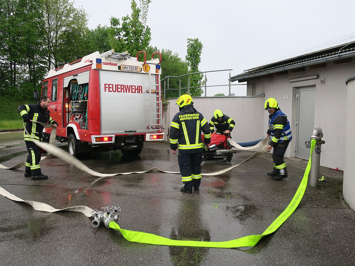 Die Mannschaft der FF Ardagger Markt erhält durch die Einsatzleitung Ardagger Stift zwei Einsatzaufgaben: die Errichtung einer Wasserentnahmestelle bei einem in der Nähe befindlichen Trinkwasser-Hochbehälter, sowie die Suche und Rettung von im Betriebsgebäude vermissten Personen mit schwerem Atemschutz.