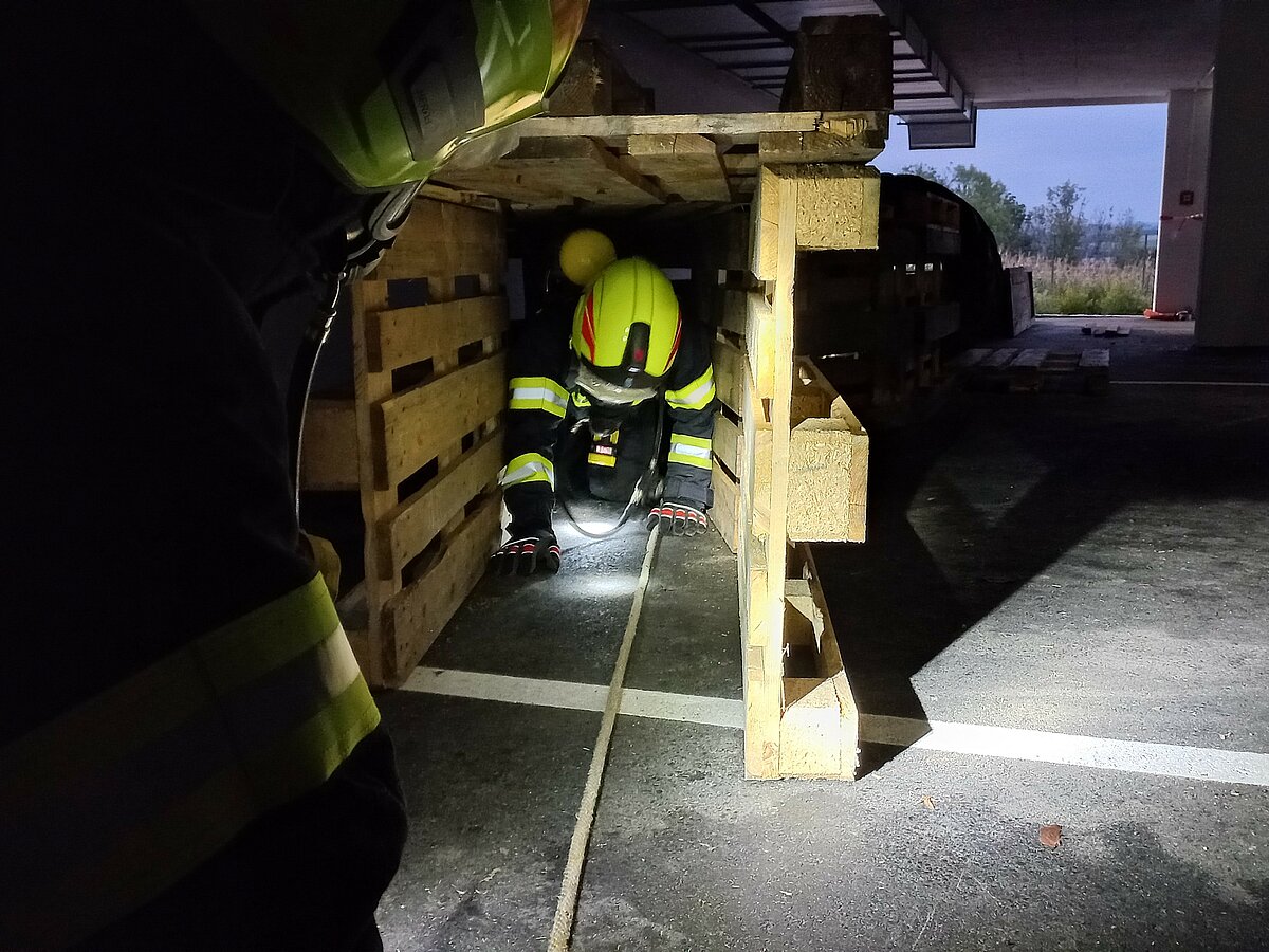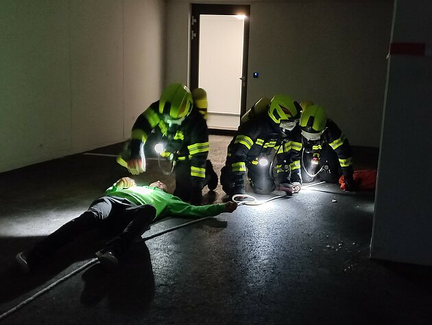 Realistische Übungsbedingungen in verrauchten Gebäuden für die Atemschutzgeräteträger werden durch Bedecken der Sichtscheiben der Atemschutzmasken simuliert. Derart "erblindet" müssen sich die Trupps im Gebäude zurechtfinden und auch eine Menschenrettung durchführen.