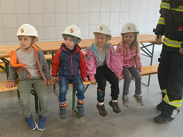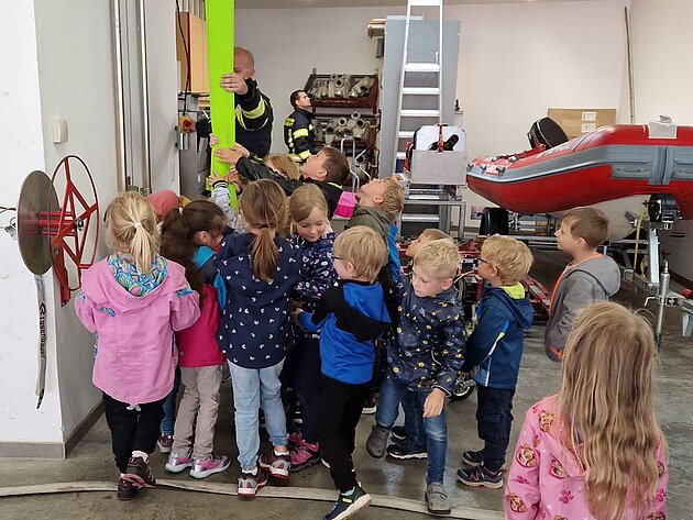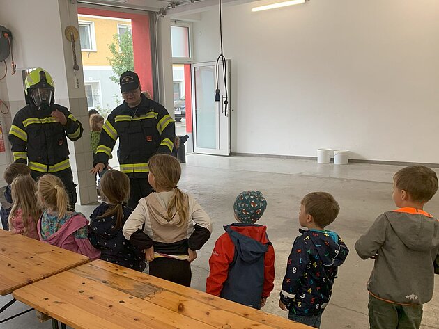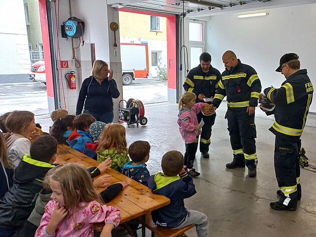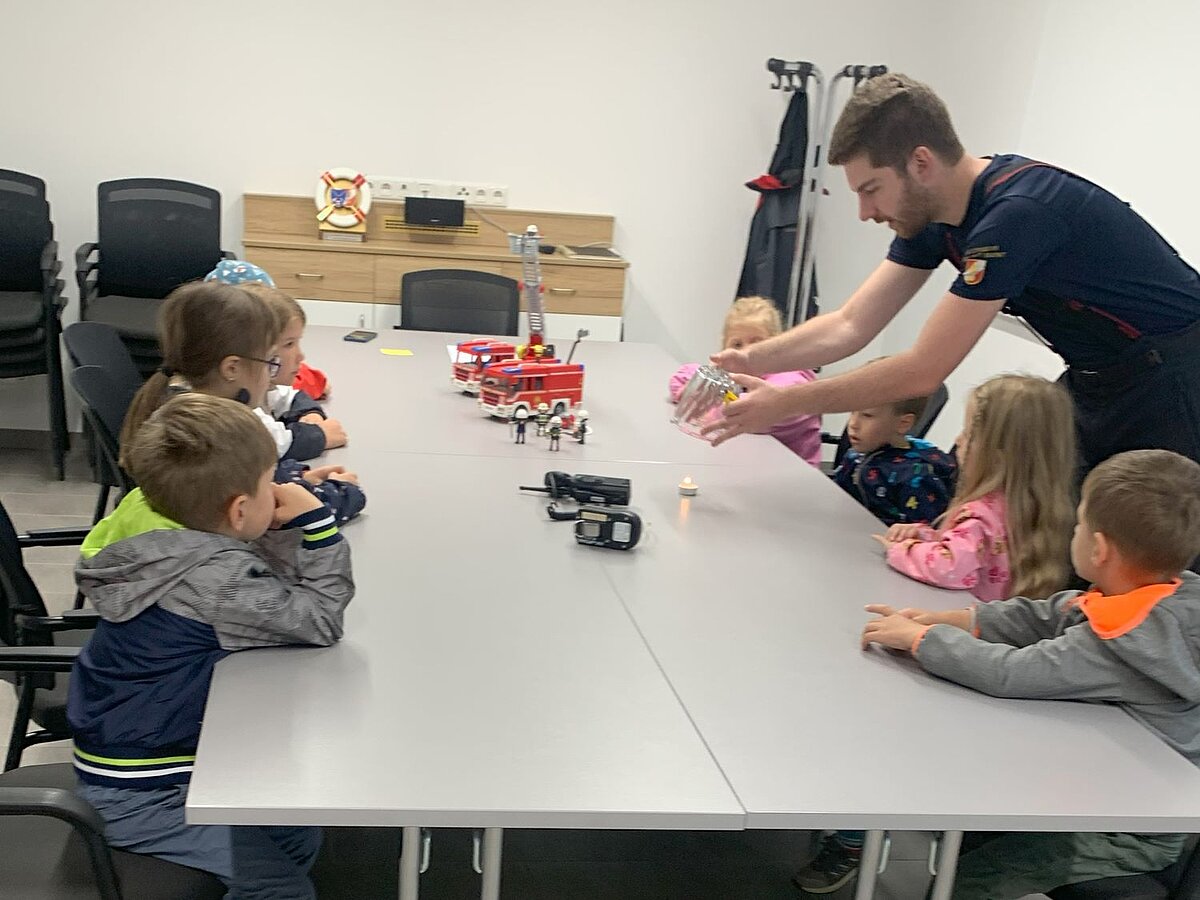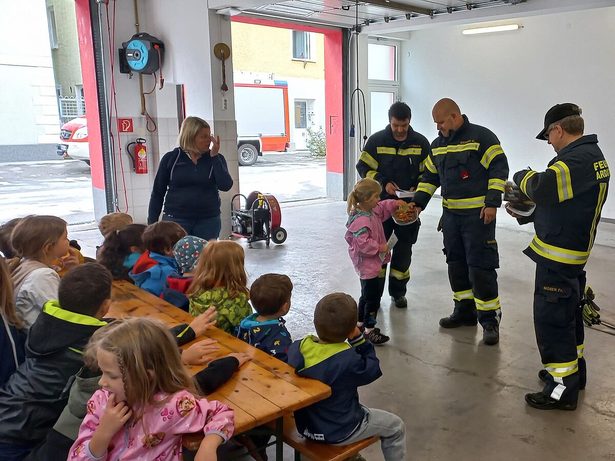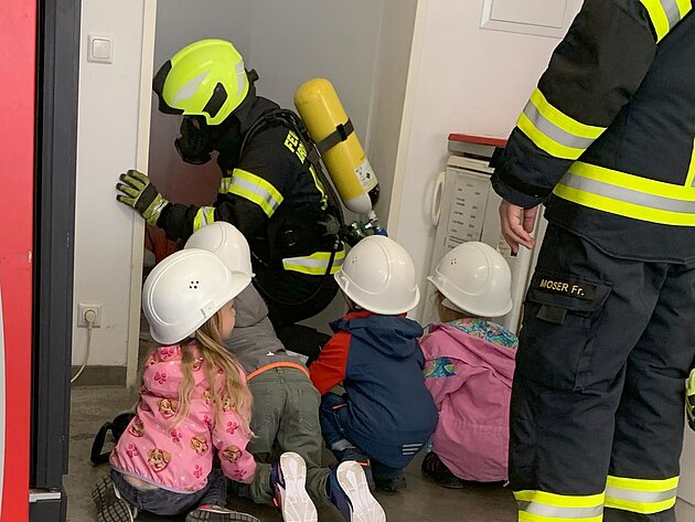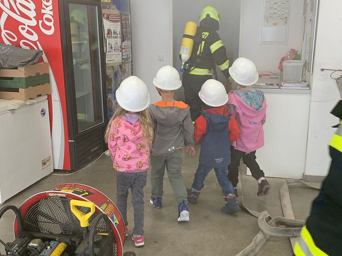 Großer Betrieb herrscht heute im Feuerwehrhaus, denn unsere Kindergartengruppe ist zu Besuch. Nach einer ausgiebigen Jause in der Fahrzeughalle lernen die jungen Gäste in kleinen Gruppen den Betrieb in der Feuerwehr kennen. Und sie können sich zu Beginn auch gleich selbst als Feuerwehrmann oder Feuerwehrfrau versuchen. Geführt von einem mit Atemschutz ausgerüsteten Feuerwehrmann erkunden sie den mit Übungsrauch eingenebelten Spindraum. Danach wird die Treffsicherheit mit dem Strahlrohr geübt, etwas über das Feuer und die Feuerwehr erzählt. Und bei Popcorn wird im "Feuerwehr-Kino" ein Einsatzfilm geschaut.