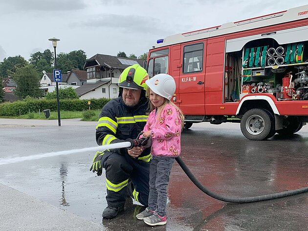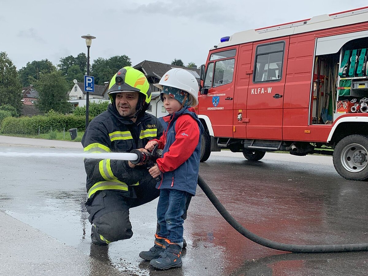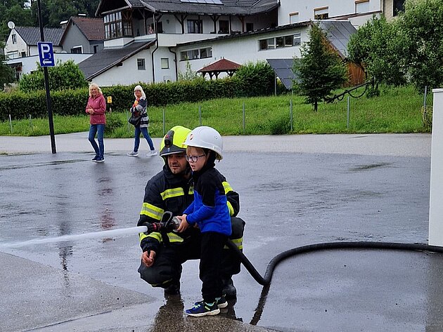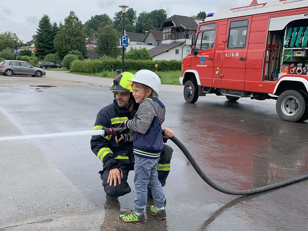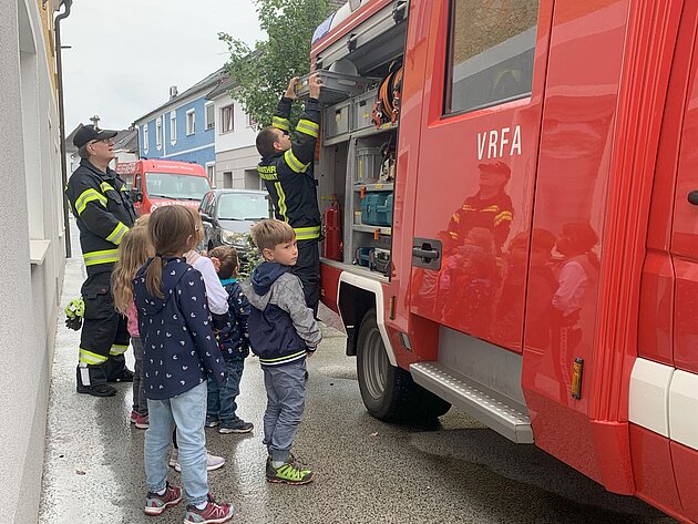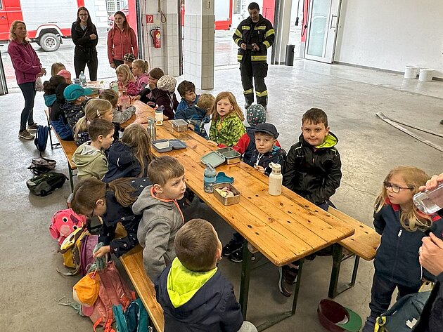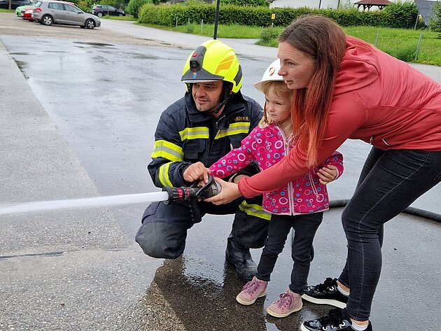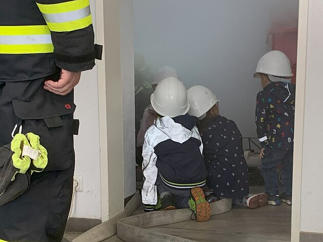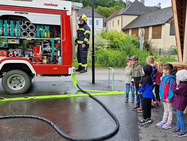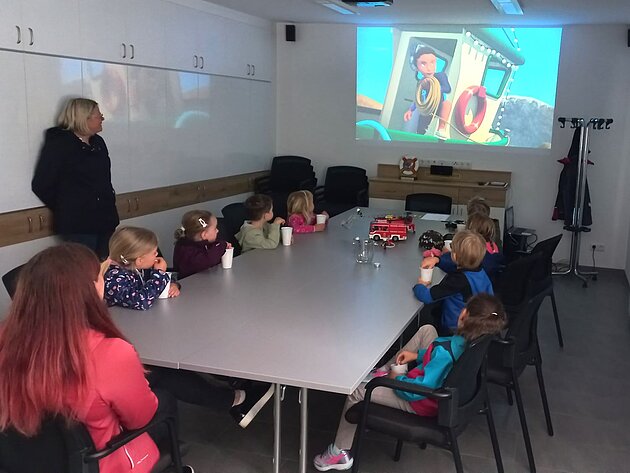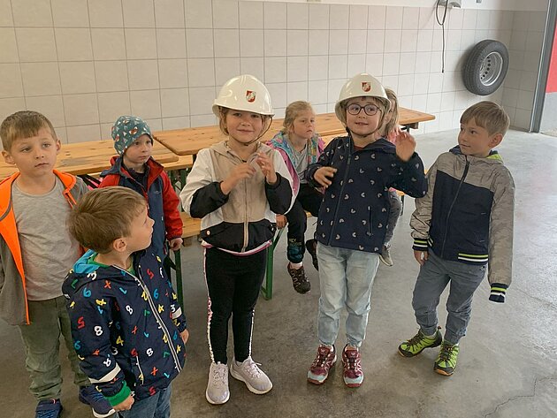 Großer Betrieb herrscht heute im Feuerwehrhaus, denn unsere Kindergartengruppe ist zu Besuch. Nach einer ausgiebigen Jause in der Fahrzeughalle lernen die jungen Gäste in kleinen Gruppen den Betrieb in der Feuerwehr kennen. Und sie können sich zu Beginn auch gleich selbst als Feuerwehrmann oder Feuerwehrfrau versuchen. Geführt von einem mit Atemschutz ausgerüsteten Feuerwehrmann erkunden sie den mit Übungsrauch eingenebelten Spindraum. Danach wird die Treffsicherheit mit dem Strahlrohr geübt, etwas über das Feuer und die Feuerwehr erzählt. Und bei Popcorn wird im "Feuerwehr-Kino" ein Einsatzfilm geschaut.