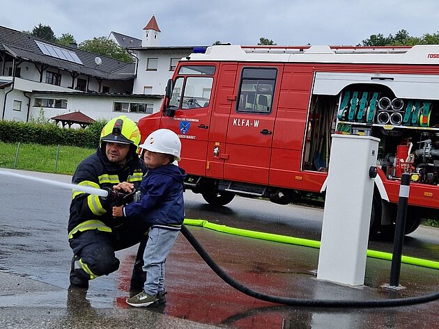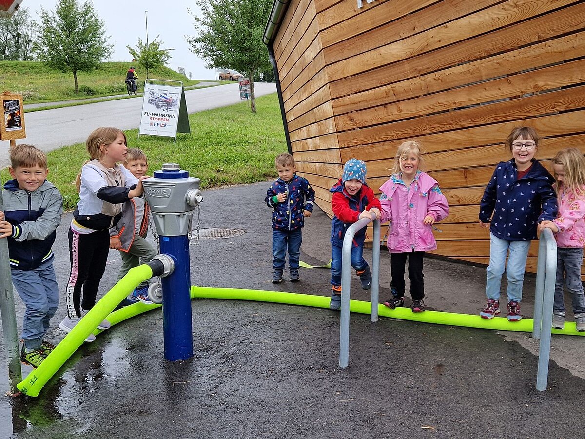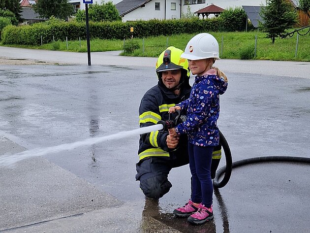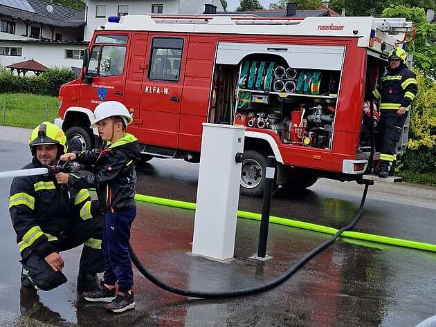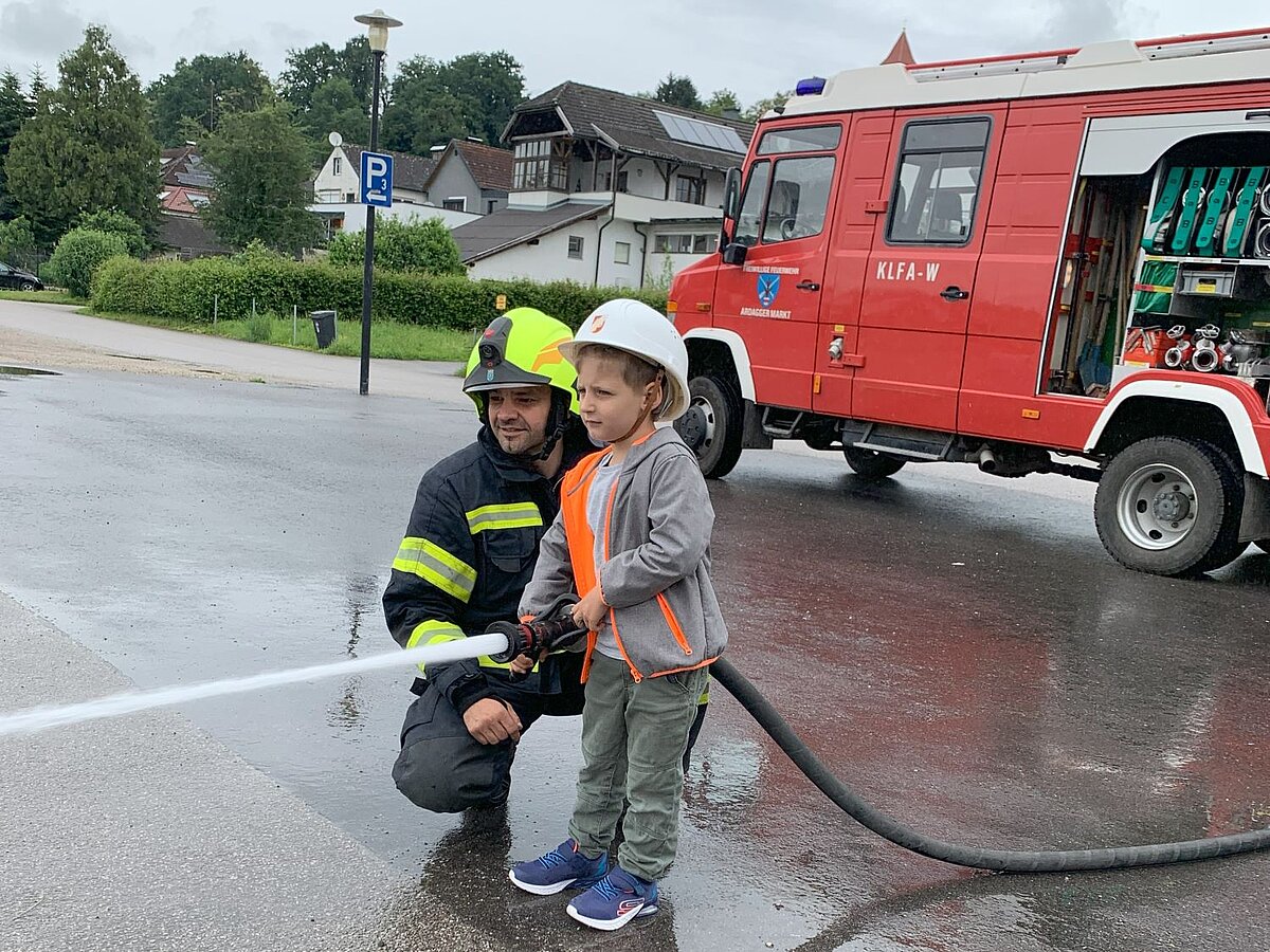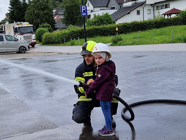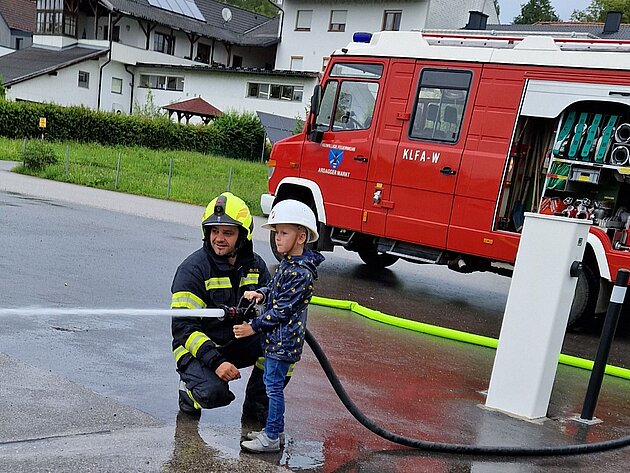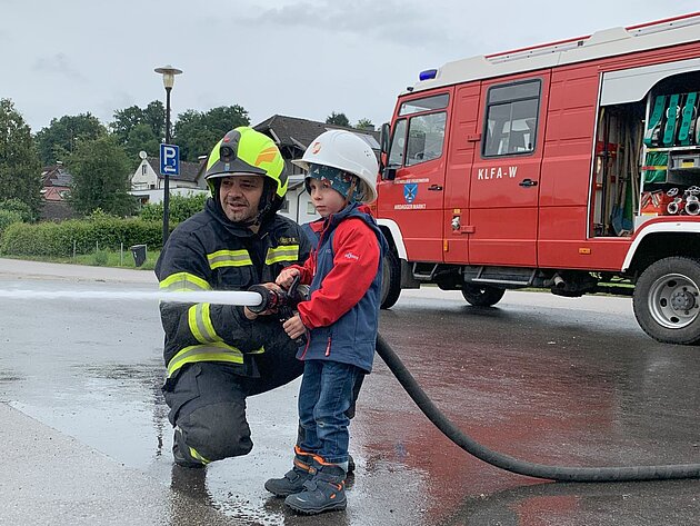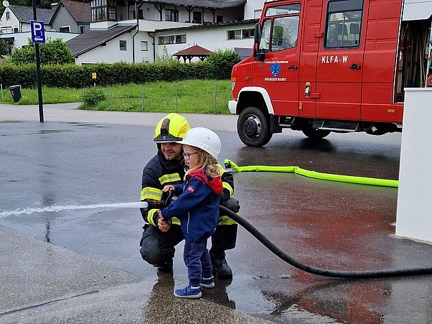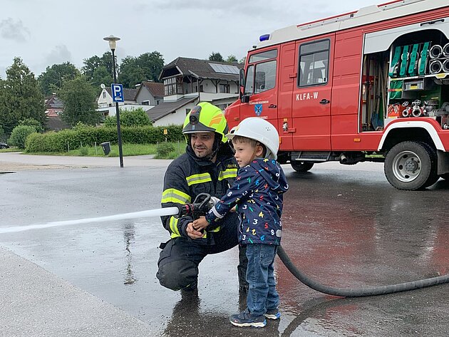 Großer Betrieb herrscht heute im Feuerwehrhaus, denn unsere Kindergartengruppe ist zu Besuch. Nach einer ausgiebigen Jause in der Fahrzeughalle lernen die jungen Gäste in kleinen Gruppen den Betrieb in der Feuerwehr kennen. Und sie können sich zu Beginn auch gleich selbst als Feuerwehrmann oder Feuerwehrfrau versuchen. Geführt von einem mit Atemschutz ausgerüsteten Feuerwehrmann erkunden sie den mit Übungsrauch eingenebelten Spindraum. Danach wird die Treffsicherheit mit dem Strahlrohr geübt, etwas über das Feuer und die Feuerwehr erzählt. Und bei Popcorn wird im "Feuerwehr-Kino" ein Einsatzfilm geschaut.