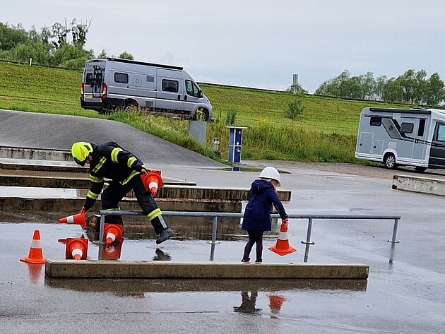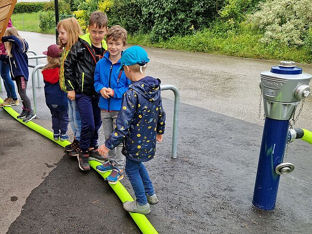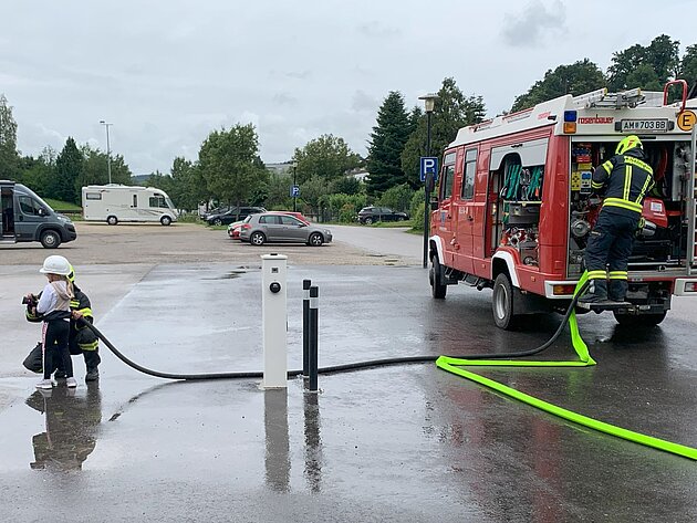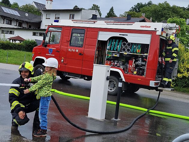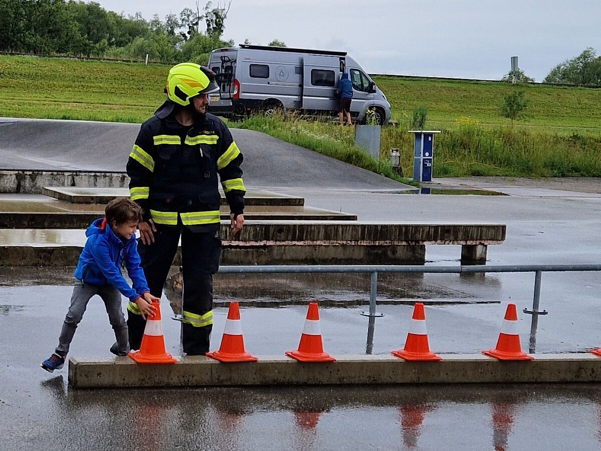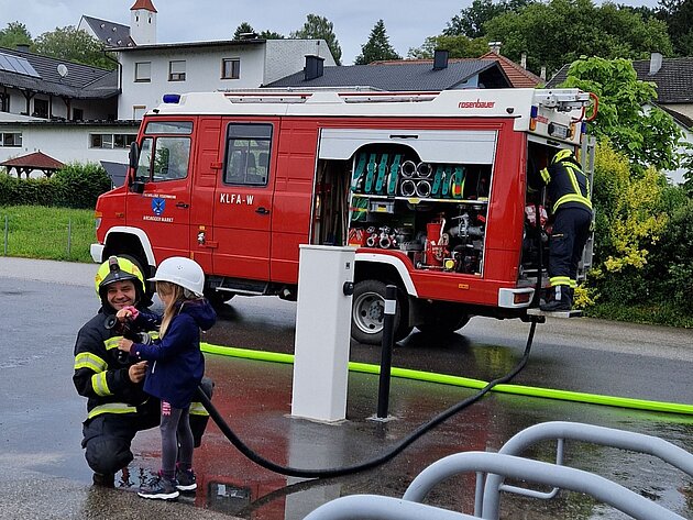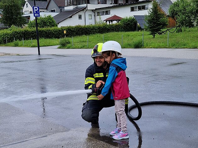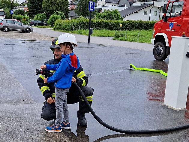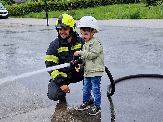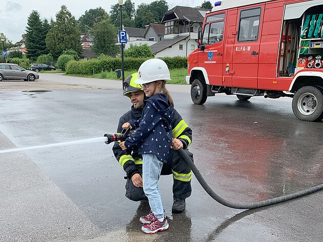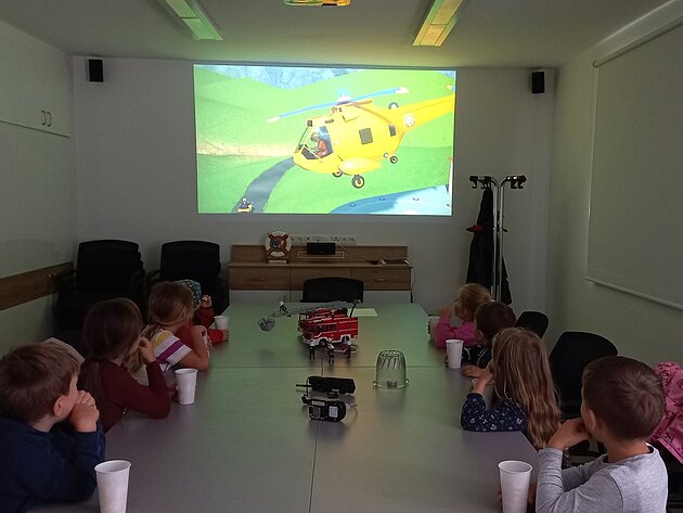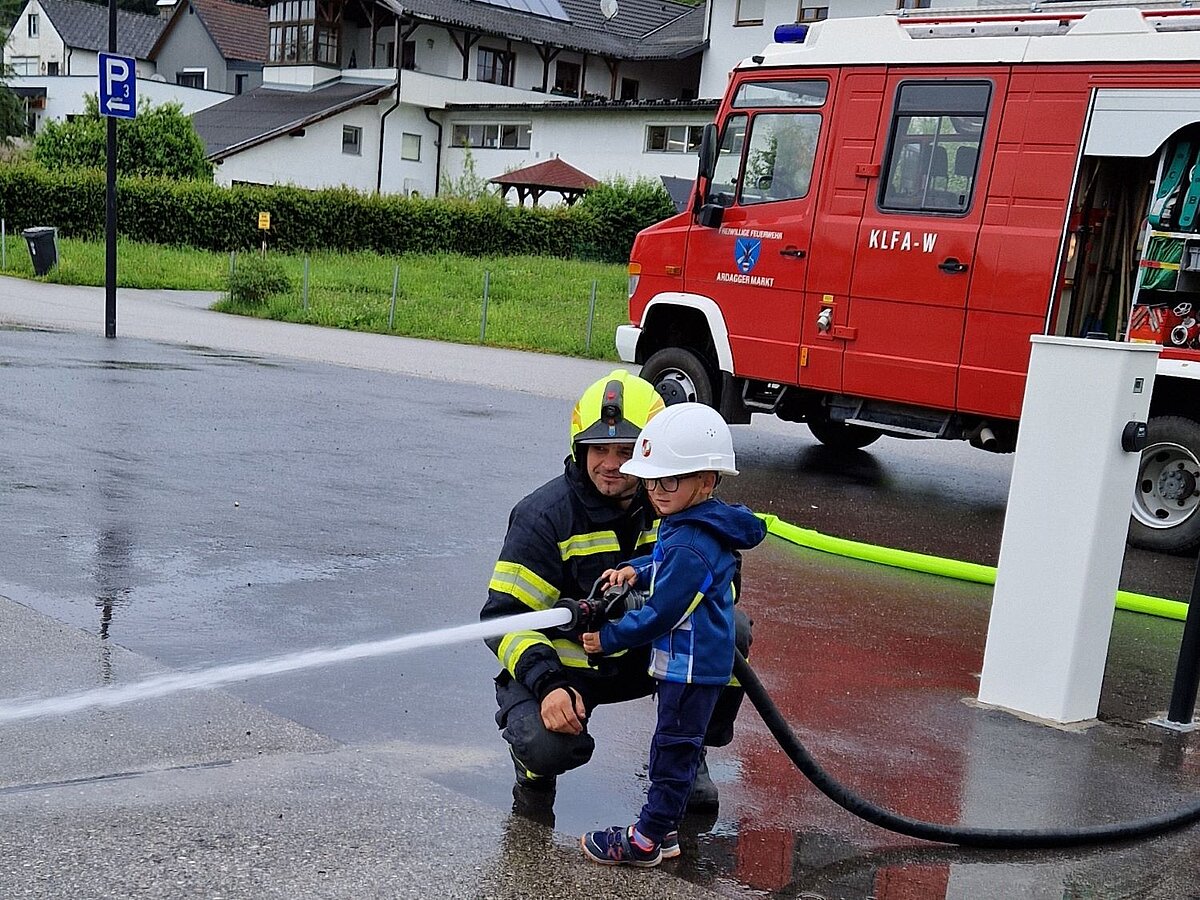 Großer Betrieb herrscht heute im Feuerwehrhaus, denn unsere Kindergartengruppe ist zu Besuch. Nach einer ausgiebigen Jause in der Fahrzeughalle lernen die jungen Gäste in kleinen Gruppen den Betrieb in der Feuerwehr kennen. Und sie können sich zu Beginn auch gleich selbst als Feuerwehrmann oder Feuerwehrfrau versuchen. Geführt von einem mit Atemschutz ausgerüsteten Feuerwehrmann erkunden sie den mit Übungsrauch eingenebelten Spindraum. Danach wird die Treffsicherheit mit dem Strahlrohr geübt, etwas über das Feuer und die Feuerwehr erzählt. Und bei Popcorn wird im "Feuerwehr-Kino" ein Einsatzfilm geschaut.