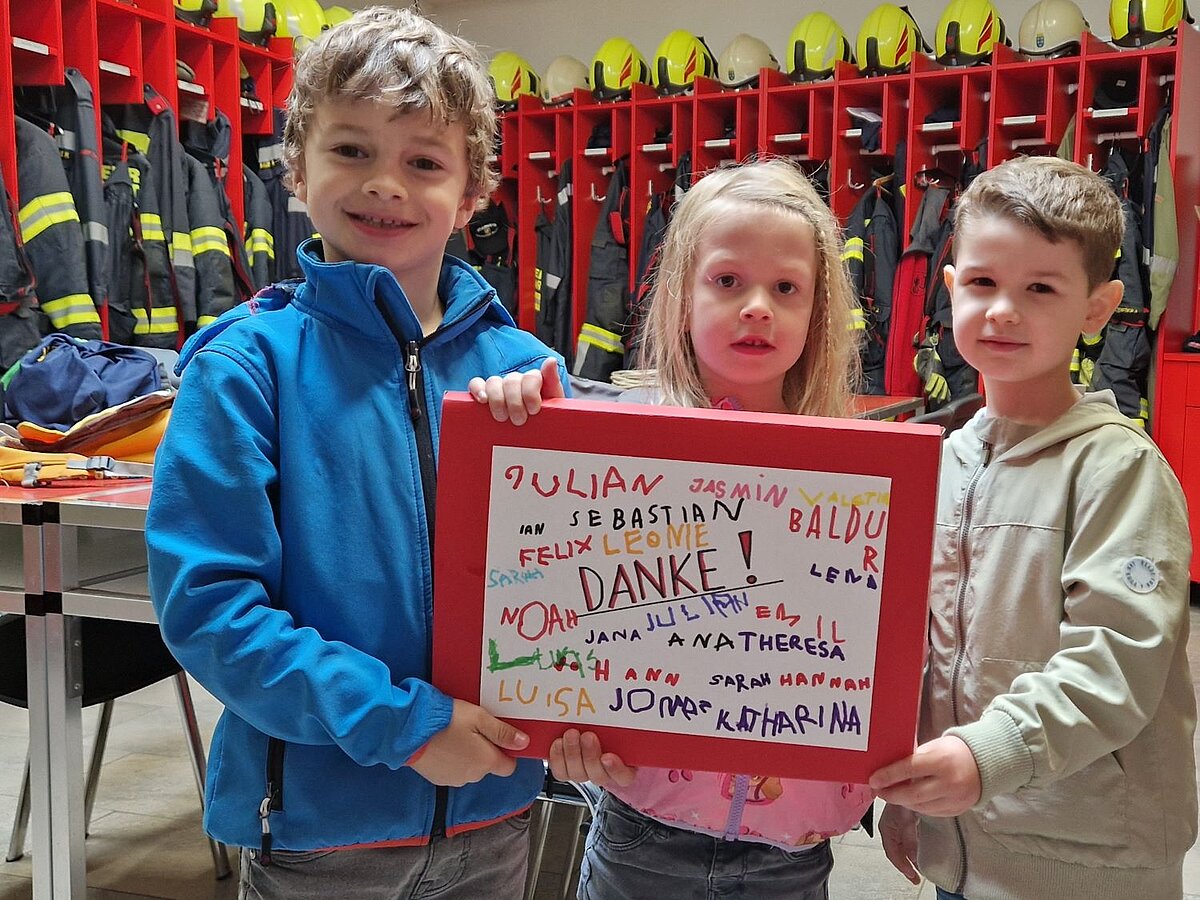 Danke für das schöne Geschenk, das wir von euch Kindergartenkindern bekommen haben, es bekommt einen Ehrenplatz in unserem Feuerwehrhaus. Schlussendlich geht es dann mit den Feuerwehrfahrzeugen wieder zurück in den Kindergarten.