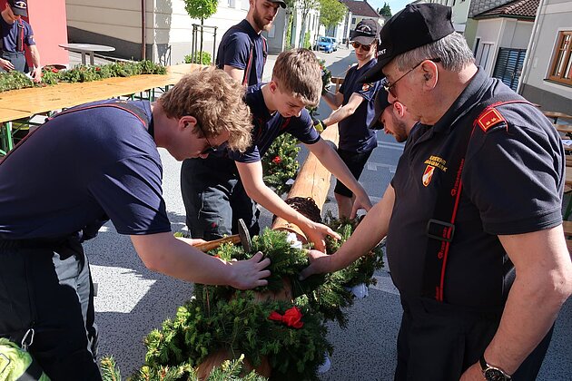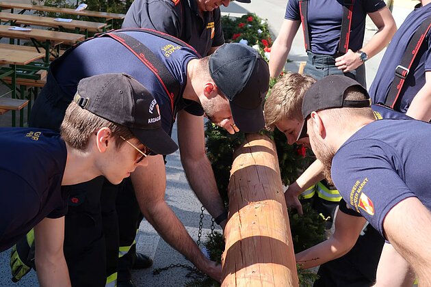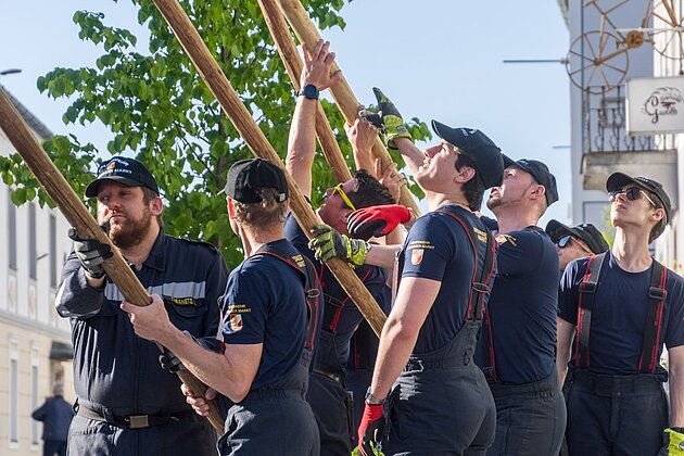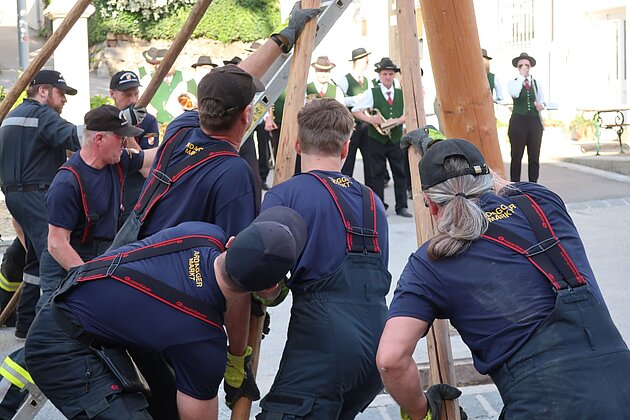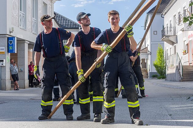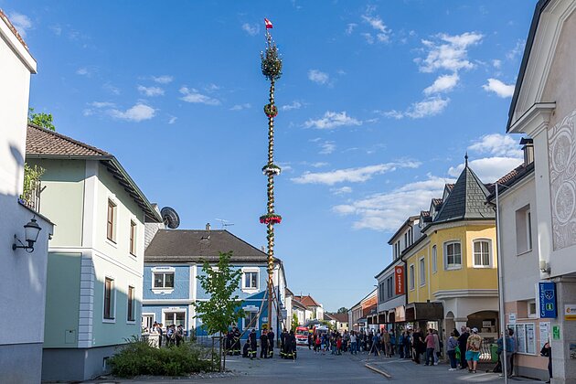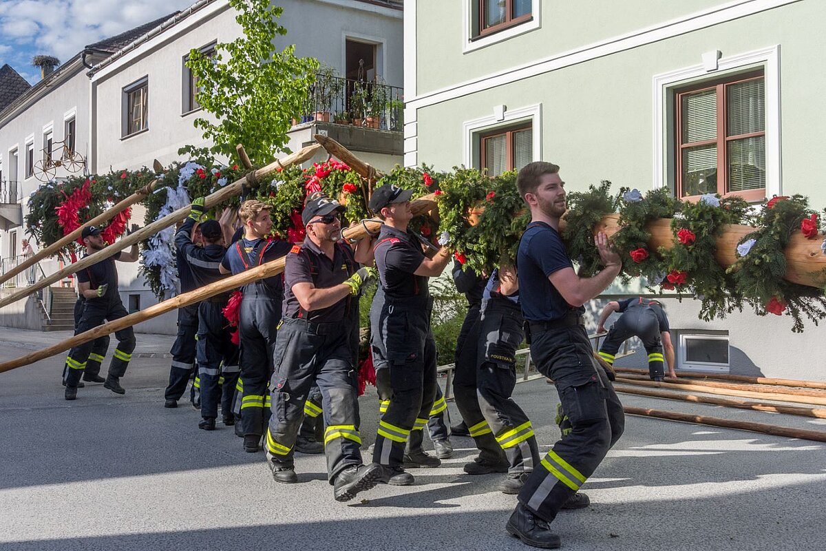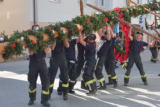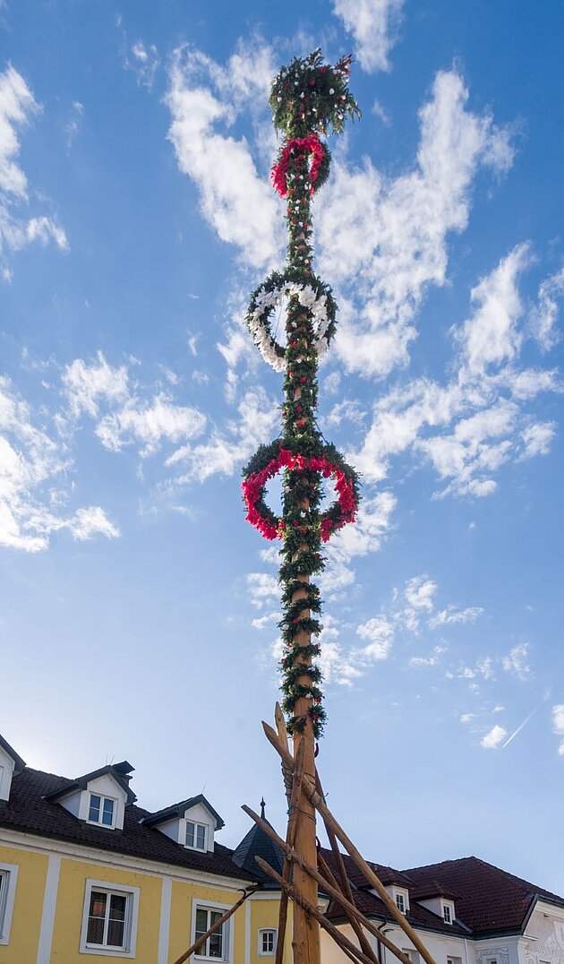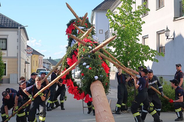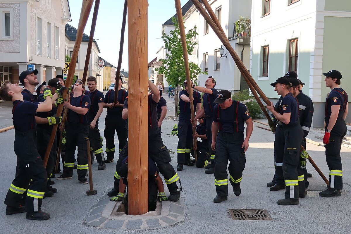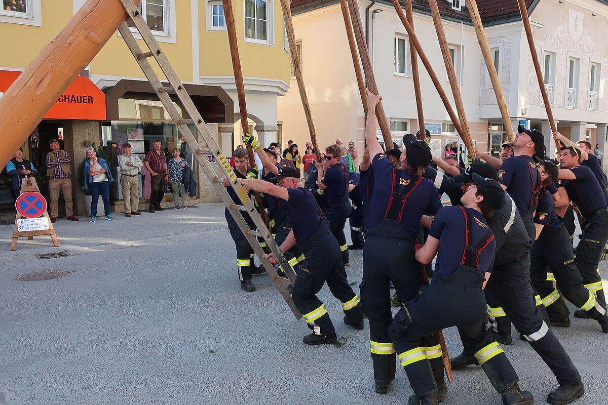 Großmächtig und stolz steht er wieder am Marktplatz: Unser Maibaum. Unter den Klängen der Markter Musikkapelle und dem Applaus der zahlreichen Zuschauer wurde er von unseren kräftigen Feuerwehrmitgliedern emporgewuchtet. Ein großes DANKE gilt den vielen fleißigen Händen, die schon einige Tage vorher Kränze gebunden, Rosen und Quasten gedreht haben.