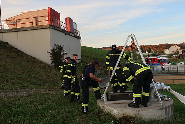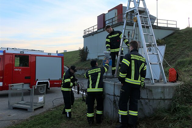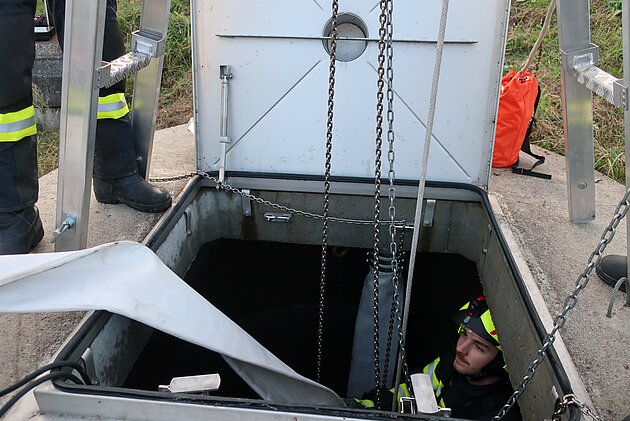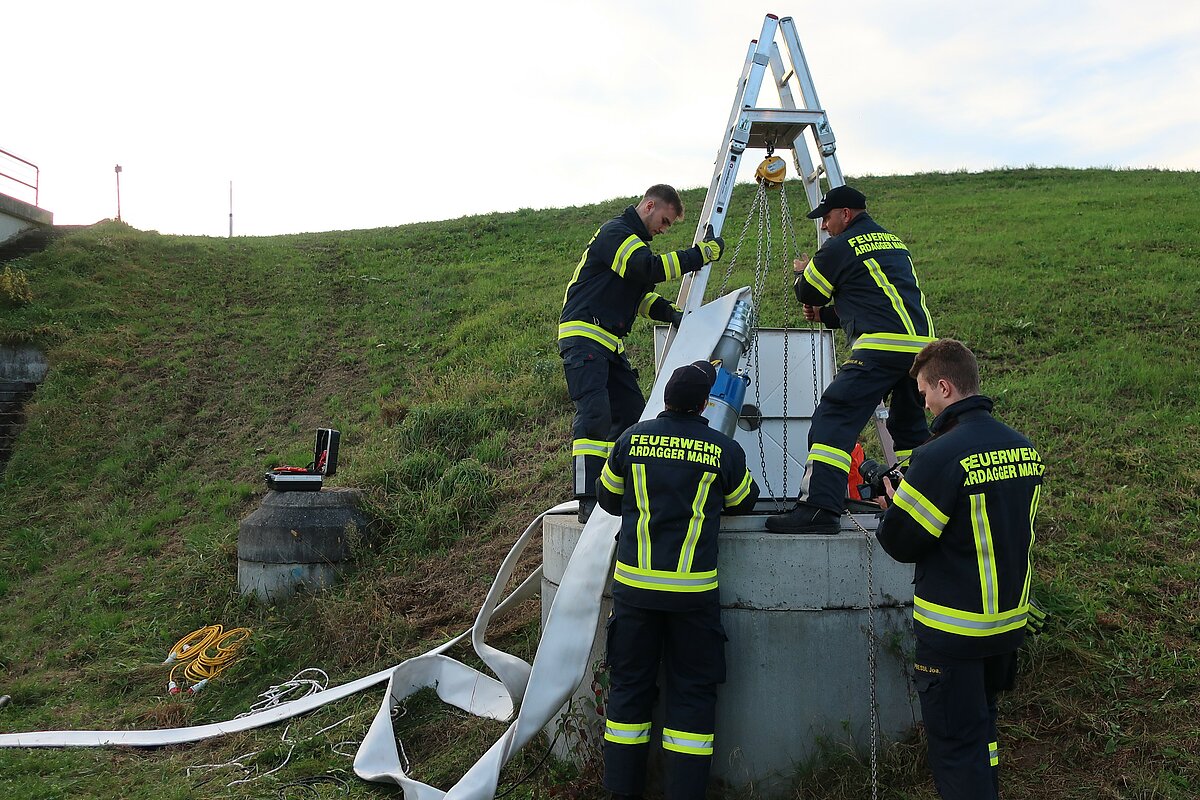 Die Überprüfung der Entlastungsbrunnen im Hochwasserschutzdamm ist vorgeschrieben und wird einmal pro Jahr durchgeführt. Zum Einen wird dabei die Mannschaft in der relativ komplexen Materie geschult, zum Anderen werden die Pumpen und die weitere Technik auf Vollständigkeit und Funktionstüchtigkeit geprüft.