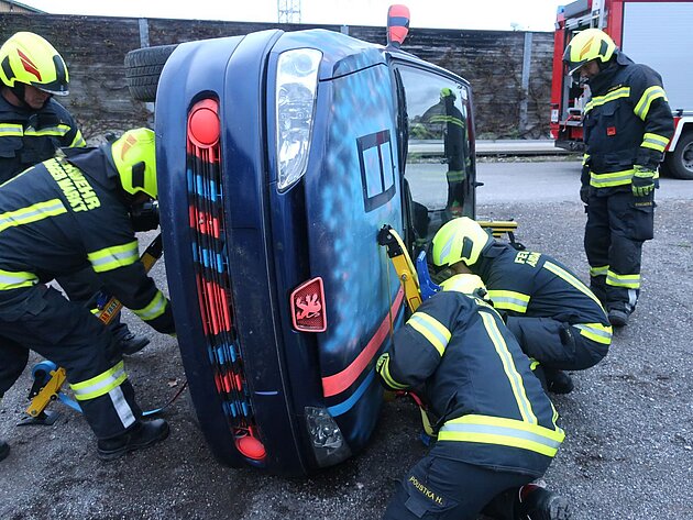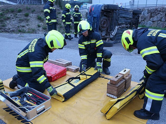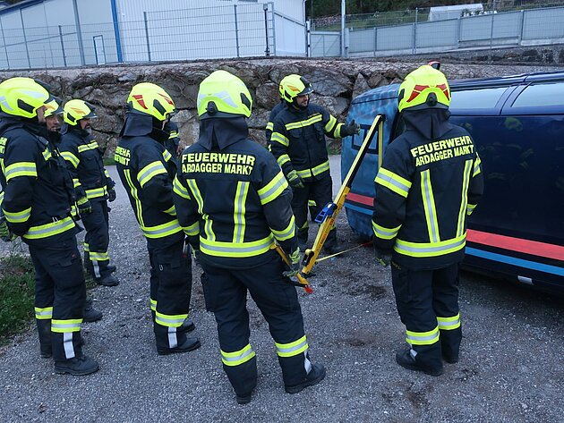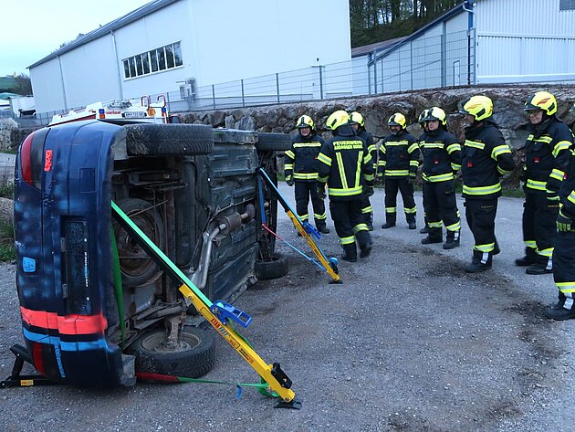 Übungsleiter und Ausbilder der "Technischen Gruppe" V Roman Pfaffeneder wiederholt mit den Übungsteilnehmern theoretisch und praktisch die Möglichkeiten der Absicherung von PKW´s. Dabei werden entsprechende Methoden auch an auf der Seite oder am Dach liegenden Fahrzeugen geübt. Die Feuerwehr Ardagger Markt ist dazu mit diversen Geräten sehr gut ausgetattet, welche auch großteils bei dieser Übung eingesetzt werden.
