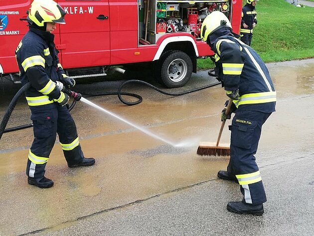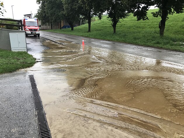 Endlich lassen die kurzen, aber extrem starken Niederschläge nach. Trotzdem ruft die Sirene die Mitglieder der FF Ardagger Markt zum Einsatz in die Donaulände. Innerhalb weniger Minuten verlassen sowohl Vorausrüstfahrzeug als auch Löschfahrzeug das Feuerwehrhaus in Richting Donaulände.