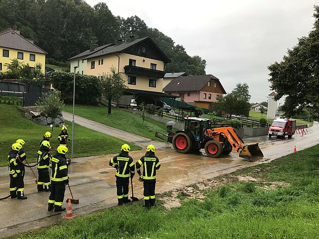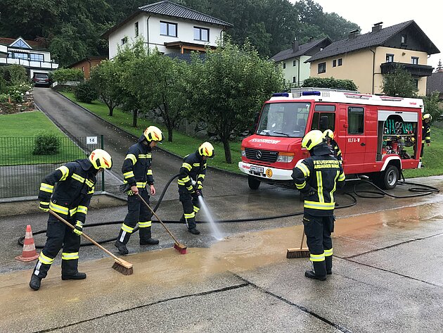 Hangwässer haben einen Teil der Gemeindestraße mit Schlamm überzogen. Unterstützt durch den Gemeindetraktor und einen weiteren Traktor eines Landwirts kann die Straße gereinigt werden. Nach knapp zwei Stunden ist der Einsatz beendet und die Einsatzbereitschaft wieder hergestellt.