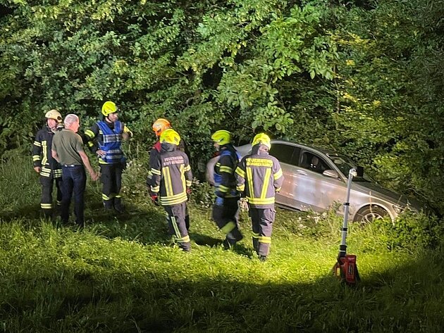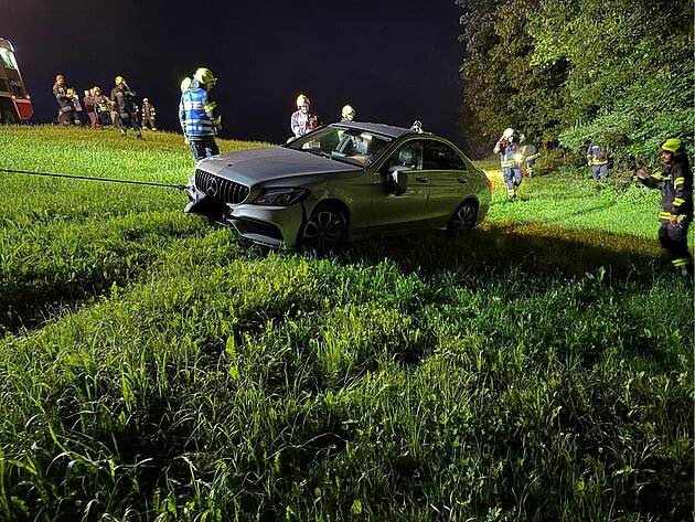 VORAUS Ardagger Markt trifft als erstes am Einsatzort ein und erkundet sie Lage. Ein PKW ist von der Straße abgekommen und über eine steile Wiese bis zum Waldrand abgerutscht. Zwei Personen befinden sich noch im Unfallfahrzeug, scheinen aber entgegen der Alarmmeldung nicht verletzt zu sein. Der kurze Zeit später eintreffende Rettungsdienst kümmert sich in weiterer Folge um die Fahrzeuginsassen.